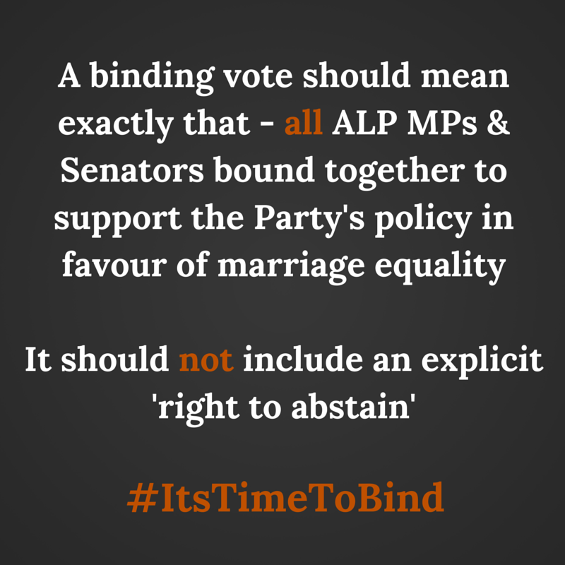A look at the suggestion by some that a binding vote should include an ‘explicit right to abstain’ for socially conservative MPs and Senators. Umm, I don’t think ‘binding’ means what you think it means… <https://alastairlawrie.net/2015/04/13/an-alp-binding-vote-for-marriage-equality-should-not-include-a-right-to-abstain/