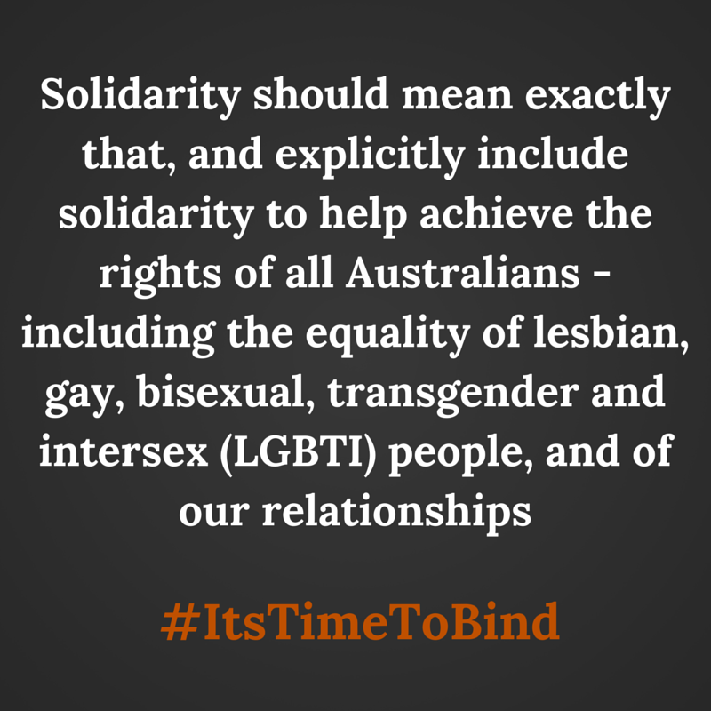 Let’s make 2015, the year when Australia embraces marriage equality. Let’s make it happen, together. It’s time. [Please, Tony, please, help pass marriage equality this year, because if it doesn’t succeed then people might question why I didn’t do everything I could to support it. If I did I would be writing a very different kind of speech, to deliver at the ALP National Conference in 6 weeks’ time, one that ended with a much stronger invocation of Gough’s message of hope: It’s Time. It’s Time to Bind.]