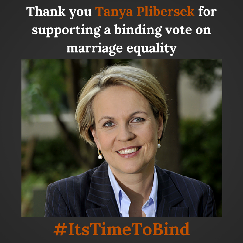 Thank you Tanya Plibersek for supportingA thank you to the Deputy Opposition Leader, the Hon Tanya Plibersek MP, and the Leader of the Opposition in the Senate, Senator the Hon Penny Wong, for supporting a binding vote: <https://alastairlawrie.net/2015/04/05/thank-you-tanya-plibersek-and-penny-wong-for-supporting-a-binding-vote-on-marriage-equality/