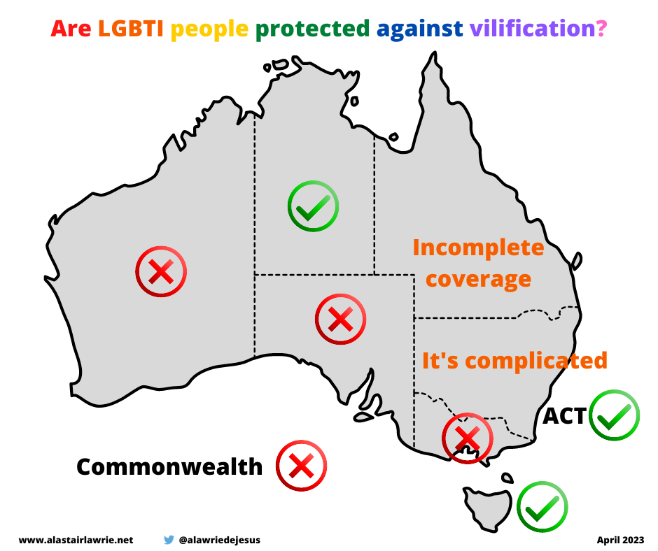There is currently no Commonwealth protection against anti-LGBTIQ vilification under the Sex Discrimination Act 1984. Protections at state and territory level are a patchwork replete with many holes, with anti-LGBTIQ vilification prohibited in Tasmania, the ACT, Queensland and Northern Territory, while civil vilification provisions in NSW cover only gay men, lesbians and some transgender people (although Crimes Act prohibitions on inciting violence apply across the LGBTIQ community). There are no protections in Victoria, South Australia or Western Australia.